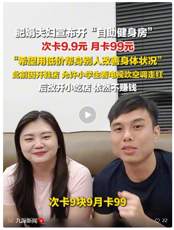 据白鹿视频,3月18日,“肥娟爱妻”邱智娟和丈夫林景欢发视频晓示将开健身房,称仍是拿到“肥娟健身”的买卖派司了,不出不测的话下个月开业。林景欢默示,次卡9.9元月卡99元,如果能帮到身边的一些东谈主,让体魄变好起来,是真的会很舒坦。