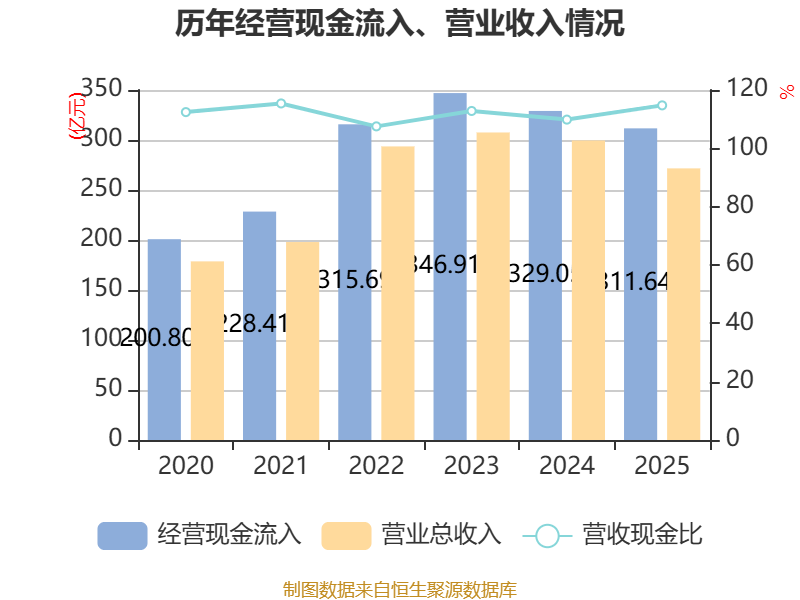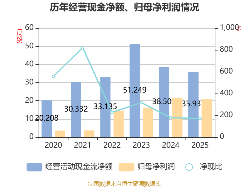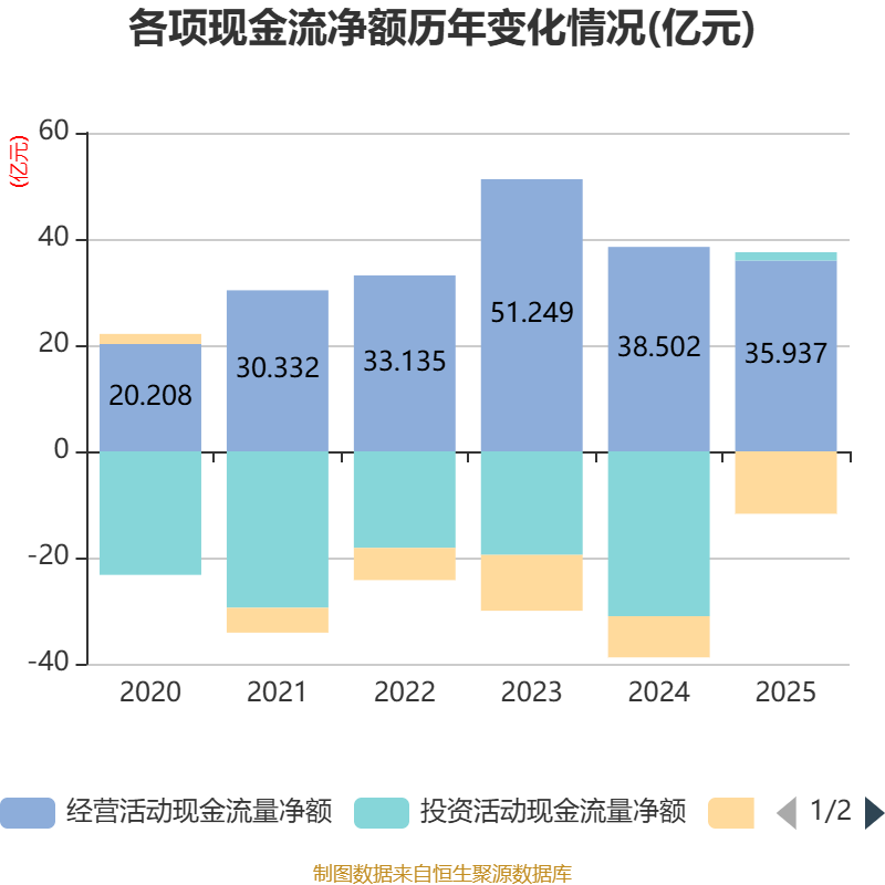 放肆2025年,公司经营活动现款流净额为35.94亿元,同比着落6.66%;筹资活动现款流净额-11.75亿元,同比减少4亿元;投资活动现款流净额1.56亿元,上年同时为-31.05亿元。