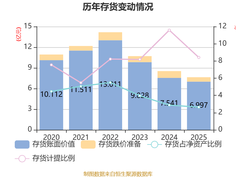 从存货变动来看,放肆2025年末,公司存货账面价值为7亿元,占净金钱的2.63%,较上年末减少5442.49万元。其中,存货跌价准备为6428.58万元,计提比例为8.41%。