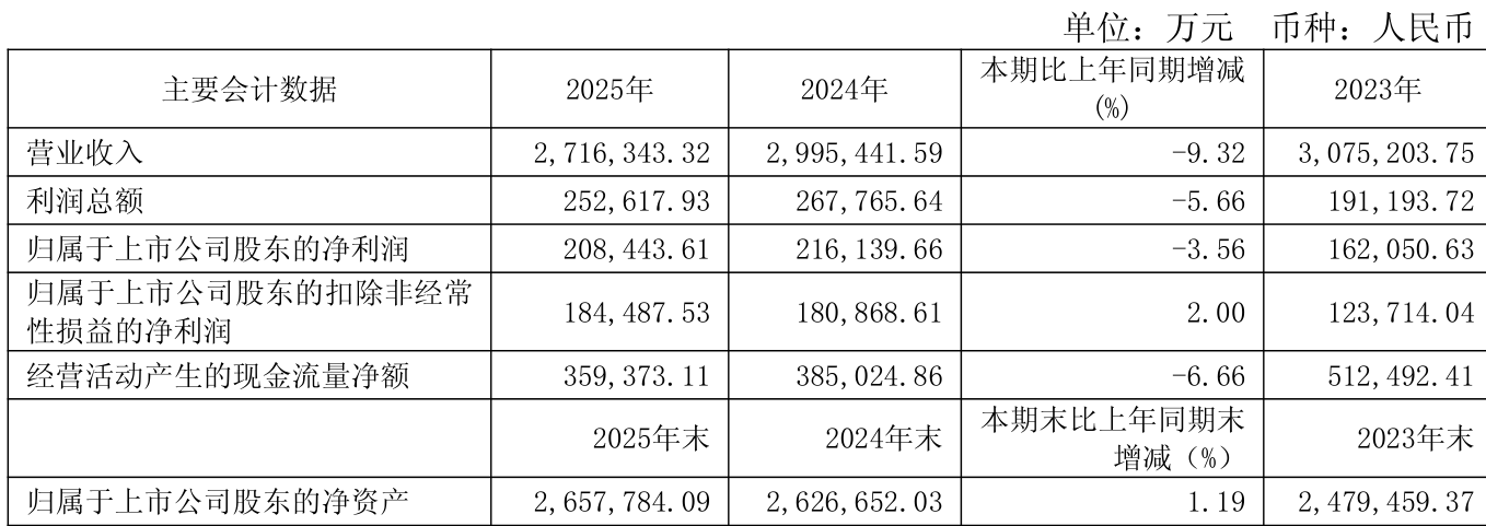 中证智能财讯海油工程(600583)3月21日露馅2025年年度敷陈。2025年,公司竣事商业总收入271.63亿元,同比着落9.32%;归母净利润20.84亿元,同比着落3.56%;扣非净利润18.45亿元,同比增长2.00%;经营活动产生的现款流量净额为35.94亿元,同比着落6.66%;敷陈期内,海油工程基本每股收益为0.47元,加权平均净金钱收益率为7.78%。公司2025年度分派预案为:拟向举座鼓励每10股派现1.96元(含税)。